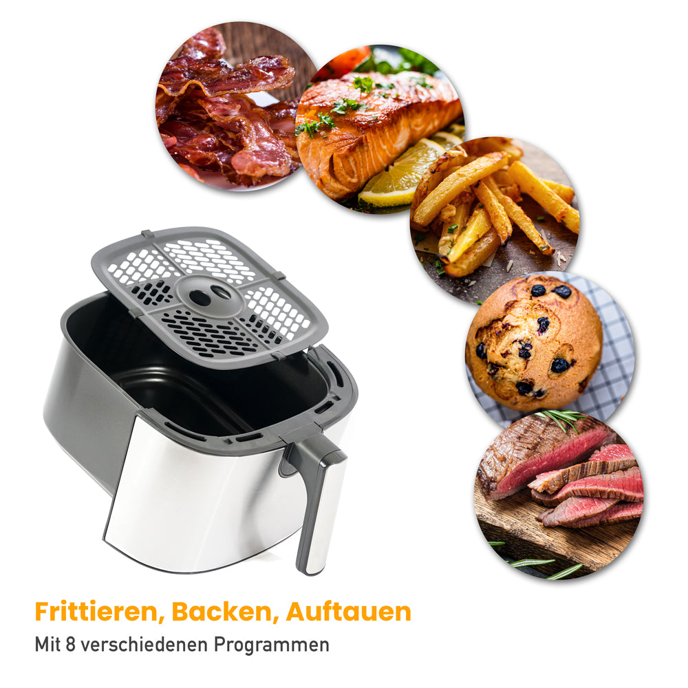 Mit unserer Heißluftfritteuse können Sie Ihre Lieblingsgerichte mit bis zu 90% weniger Fett zubereiten, ohne auf den vollen Geschmack und die Knusprigkeit zu verzichten.